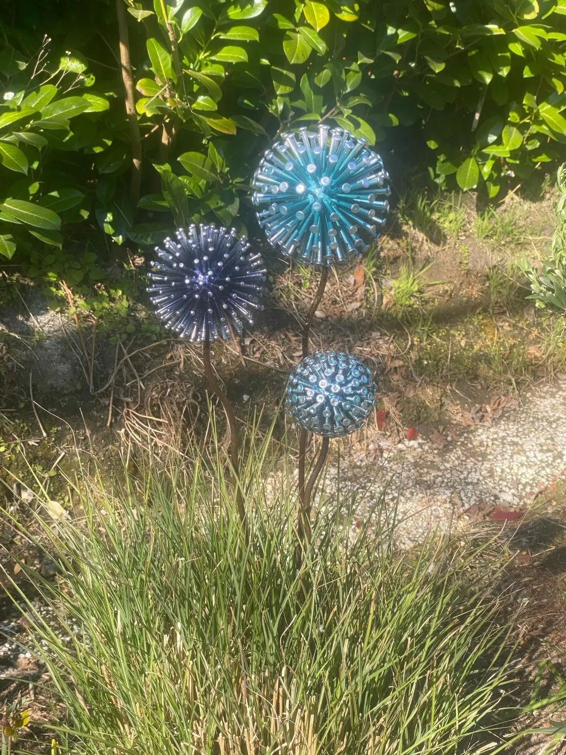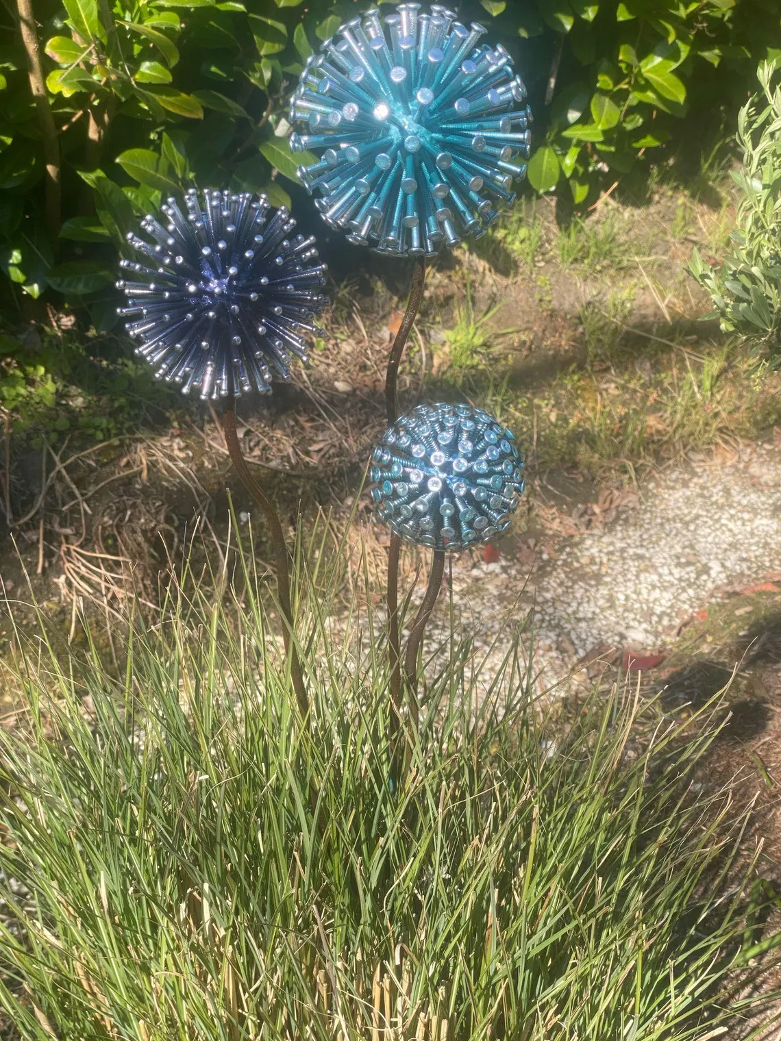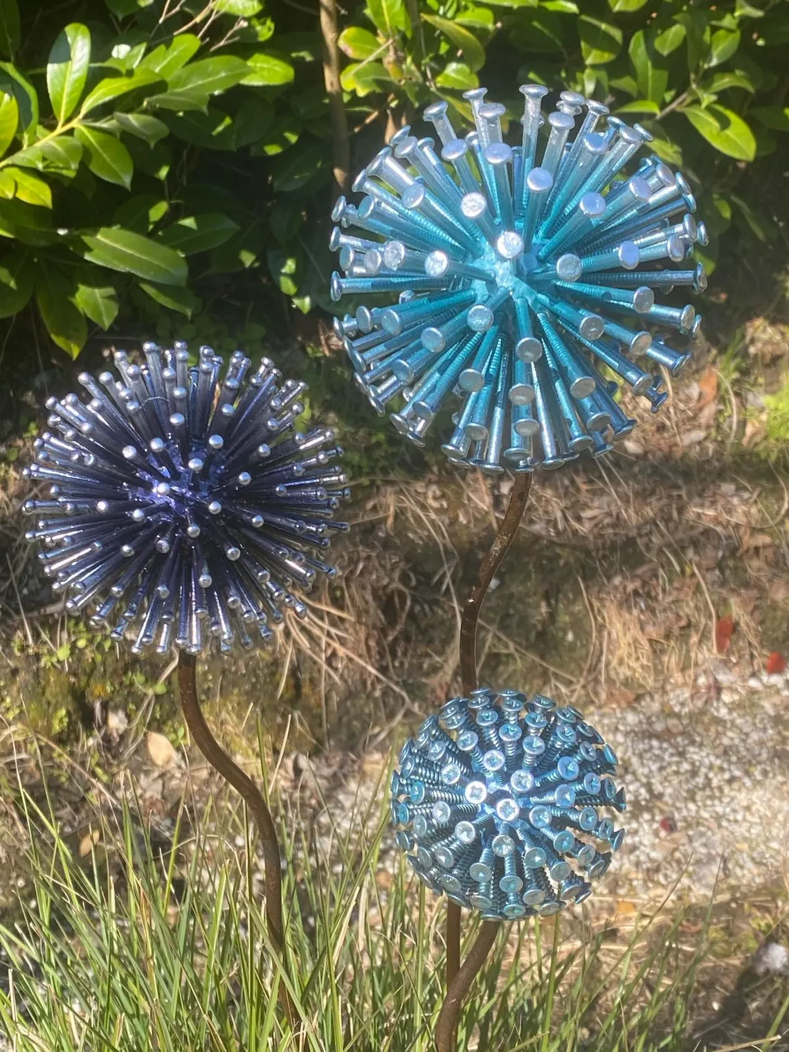 The Blue & Purple Dandelion Set transforms your garden with colour, texture, and artistry. This handcrafted collection includes three sculptural dandelions in rich blue, deep purple, and shimmering silver. Each piece makes a bold yet elegant statement indoors or outdoors. Place them together for impact or separate them to highlight different areas of your space.