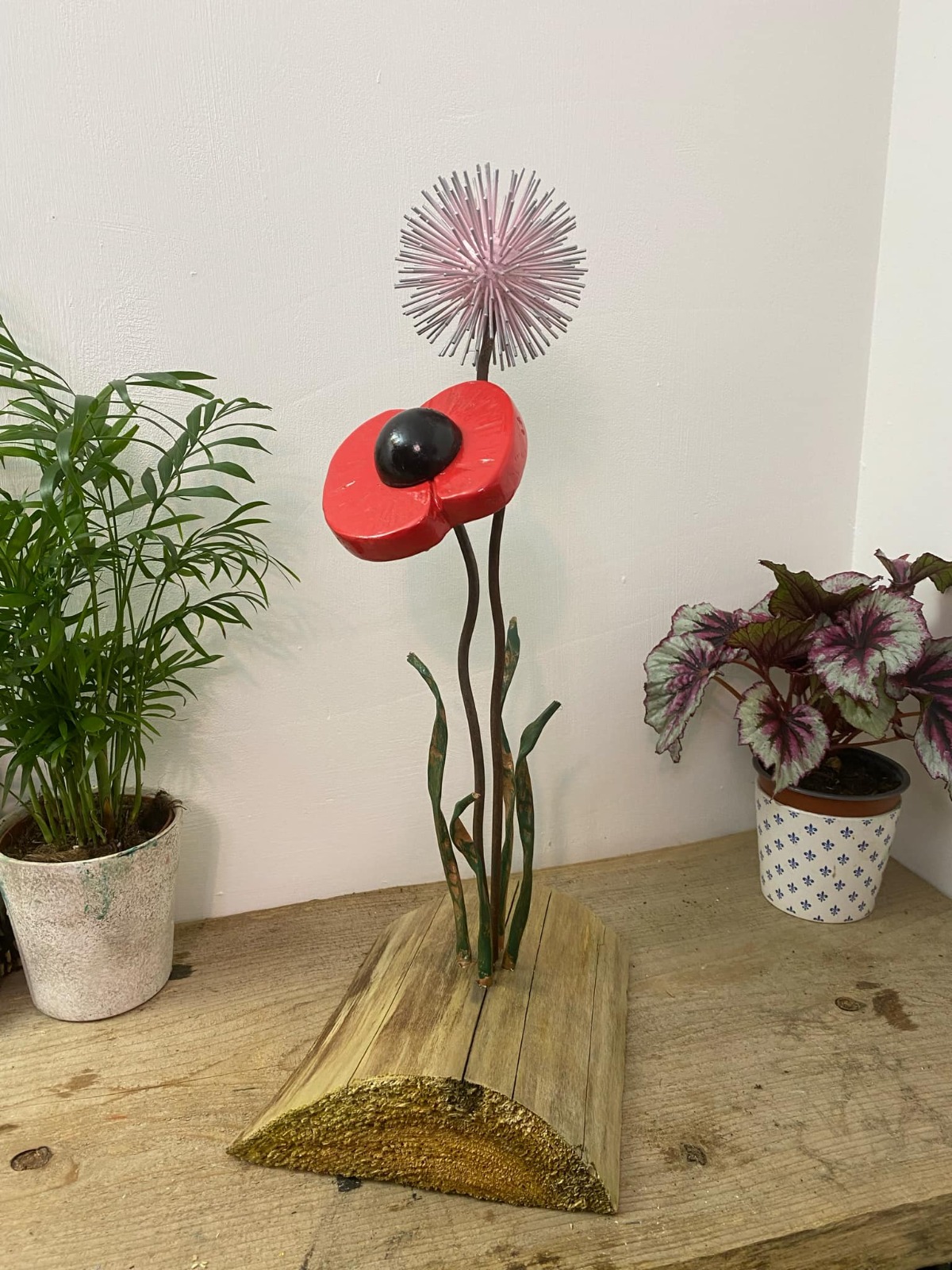 The Poppy & Pink Dandelion Ornament is a handcrafted sculpture featuring a vibrant red poppy paired with a delicate pink dandelion. Perfect for garden, patio, or indoor display, this aluminium garden ornament is designed to bring colour, movement, and charm to any space.